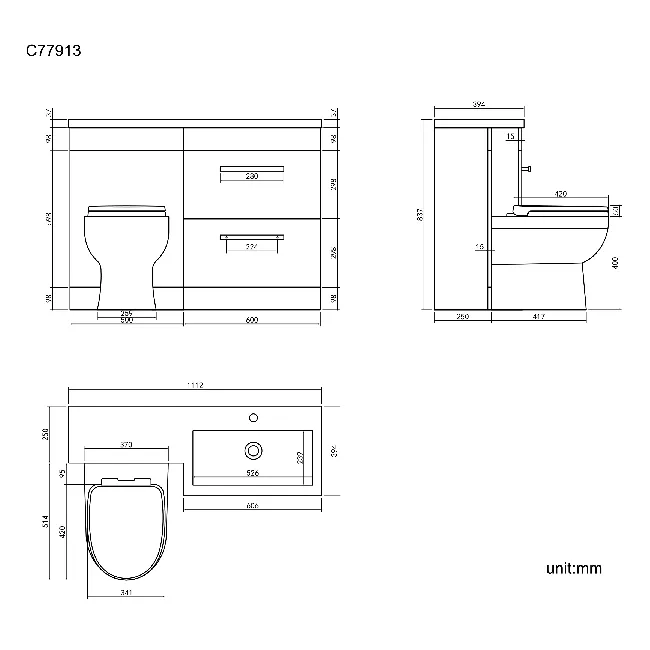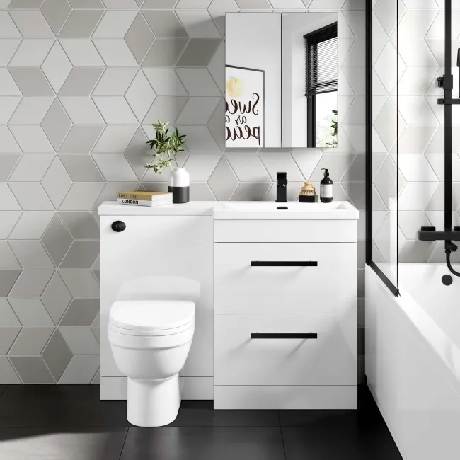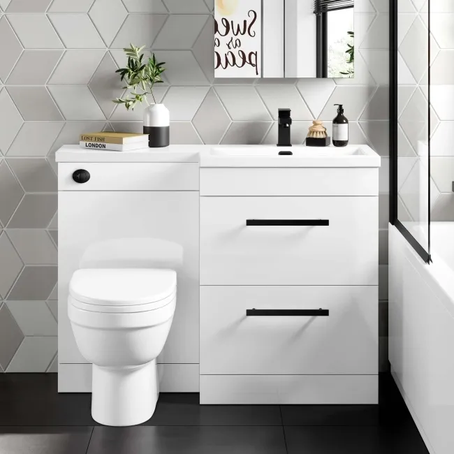 Avon Gloss White Combination Basin Drawer and Aruba Toilet 1100mm - Black Accents - Right Handed