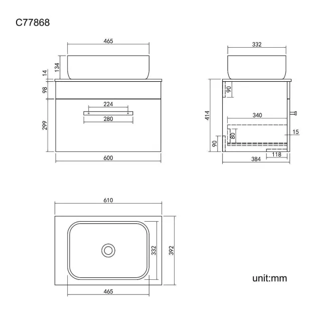 Avon Gloss White Wall Hung Drawer Vanity with Marble Top & Curved Counter Top Basin 600mm - Black Accents