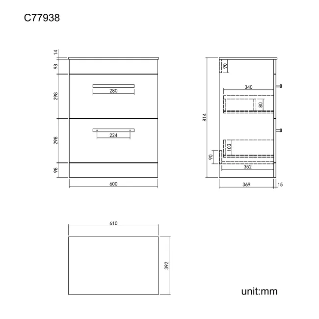 Avon Stone Grey Counter Top Vanity Drawer with Marble Top 600mm - Black Accents