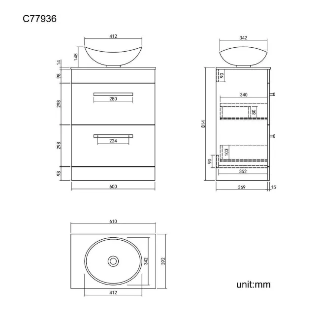 Avon Stone Grey Vanity Drawer with Marble Top & Oval Counter Top Basin 600mm - Black Accents