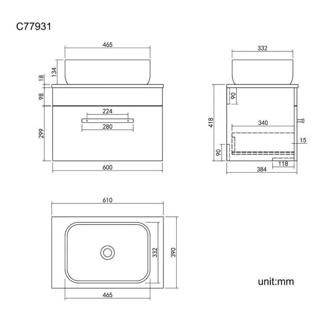 Avon Stone Grey Wall Hung Drawer Vanity with Curved Counter Top Basin 600mm - Black Accents