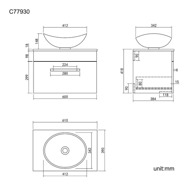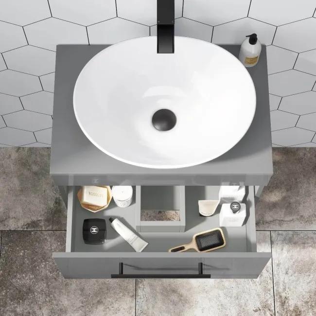 Avon Stone Grey Wall Hung Drawer Vanity with Oval Counter Top Basin 600mm - Black Accents