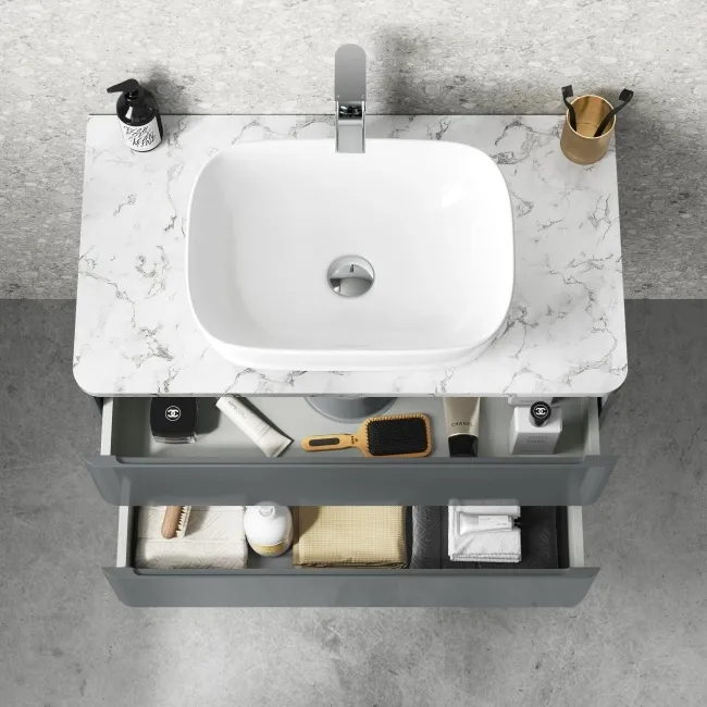 Corsica Tungsten Grey Wall Hung Drawer Vanity with Marble Top & Curved Counter Top Basin 800mm