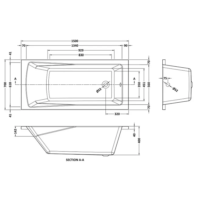 Hereford 1500x700 Square Shower Bath & 6mm Easy Clean Brushed Brass Framed Bath Screen