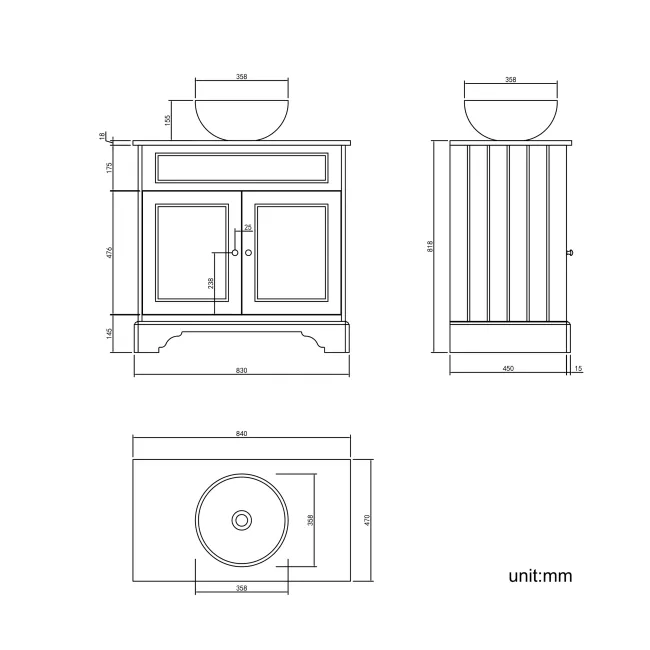 Lucia Chalk White Vanity with Oak Effect Top & Round Counter Top Basin 840mm - Brushed Brass Accents