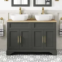 Lucia Graphite Grey Double Vanity with Oak Effect Top & Curved Counter Top Basin 1200mm - Brass Knurled Handles