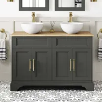 Lucia Graphite Grey Double Vanity with Oak Effect Top & Round Counter Top Basin 1200mm - Brass Knurled Handles