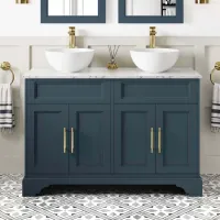 Lucia Inky Blue Double Vanity with Marble Top & Round Counter Top Basin 1200mm - Brass Knurled Handles