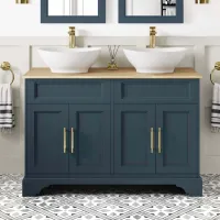 Lucia Inky Blue Double Vanity with Oak Effect Top & Oval Counter Top Basin 1200mm - Brass Knurled Handles