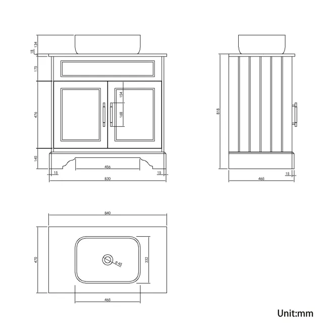 Lucia Inky Blue Vanity with Oak Effect Top & Curved Counter Top Basin 840mm - Brass Knurled Handles