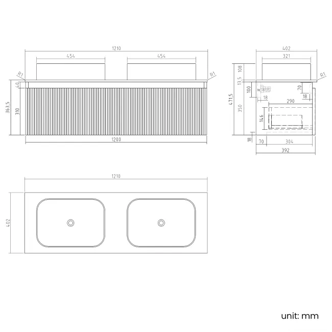 Malta Fluted Black Walnut Double Wall Hung Drawer Vanity with Marble Top & Marin Basin 1200mm