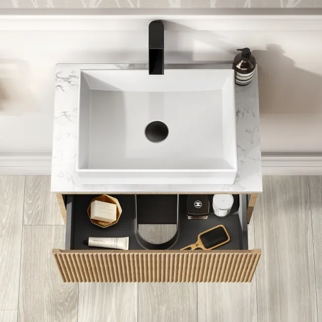 Malta Fluted Country Oak Wall Hung Drawer Vanity with Marble Top & Cody Basin 600mm