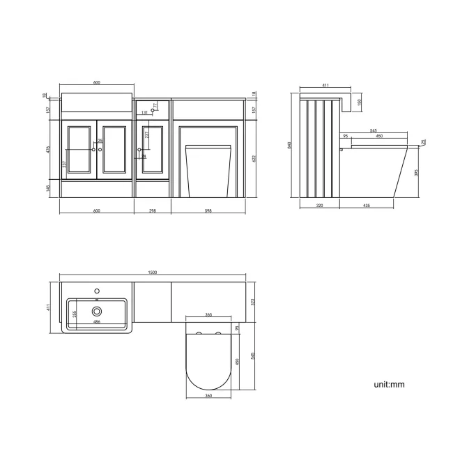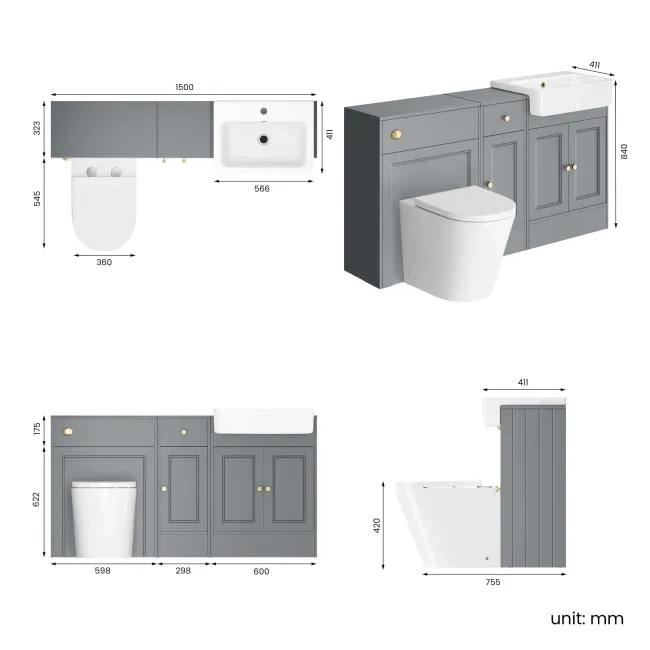Monaco Dove Grey Combination Vanity Basin and Boston Toilet 1500mm - Brushed Brass Accents