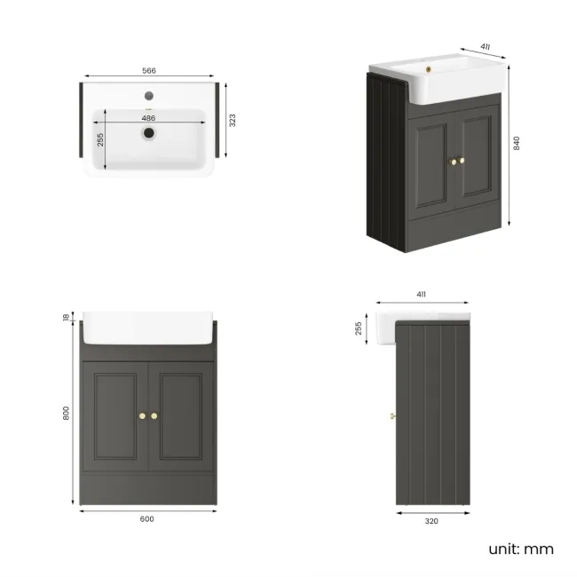 Monaco Graphite Grey Basin Vanity 600mm - Brushed Brass Accents