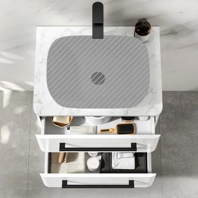 Omaha Gloss White Wall Hung Drawer Vanity with Marble Top 600mm (Excludes Counter Top Basin) - Black Accents