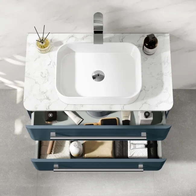 Omaha Navy Blue Wall Hung Drawer Vanity with Marble Top & Marin Basin 800mm