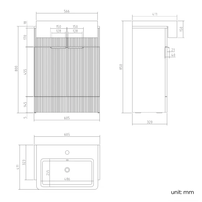 Sicily Fluted Coastal White Vanity with Semi Recessed Basin 600mm - Black Accents